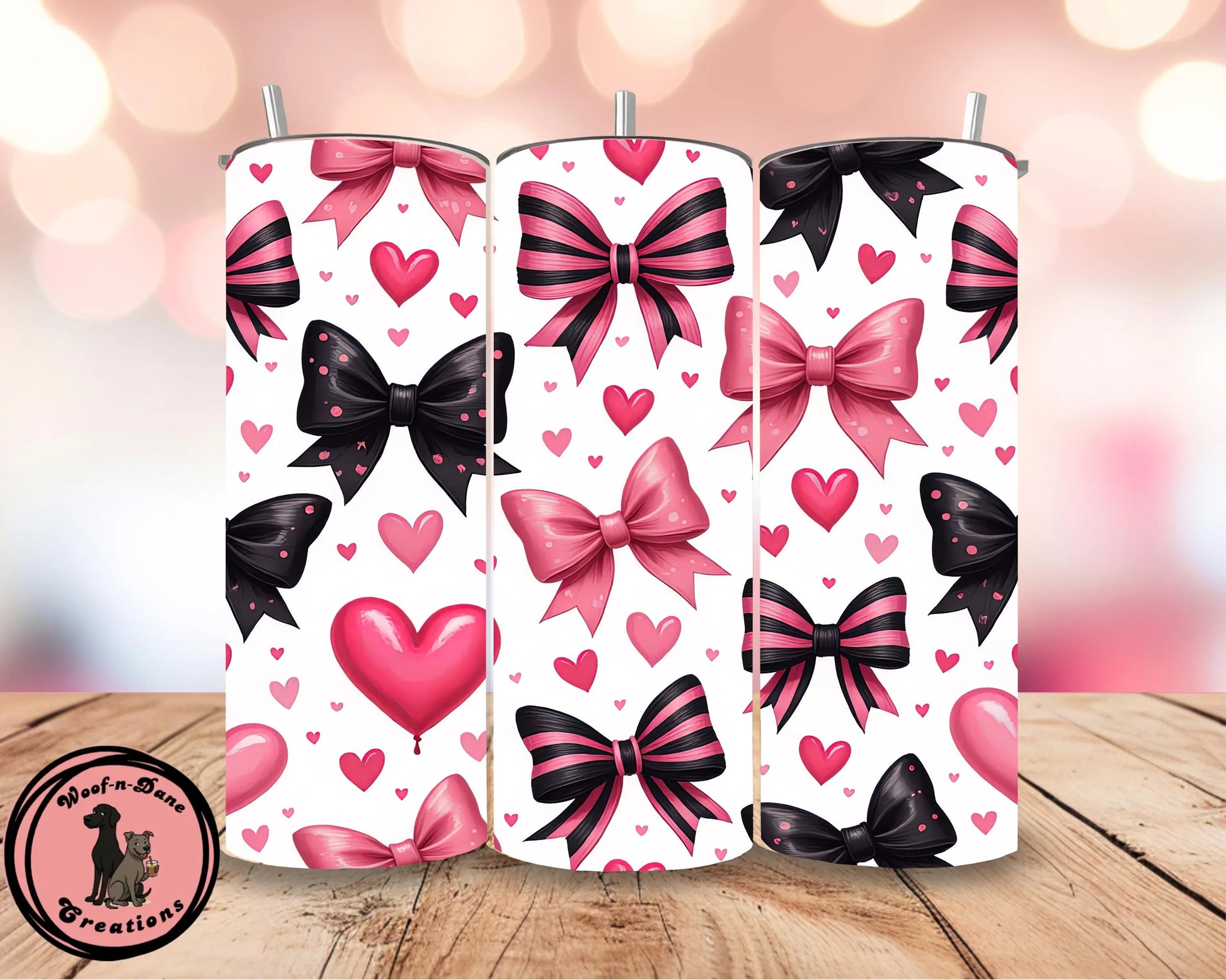Coquette Bow Tumbler: Pink & Black Hearts, 20oz Skinny Cup