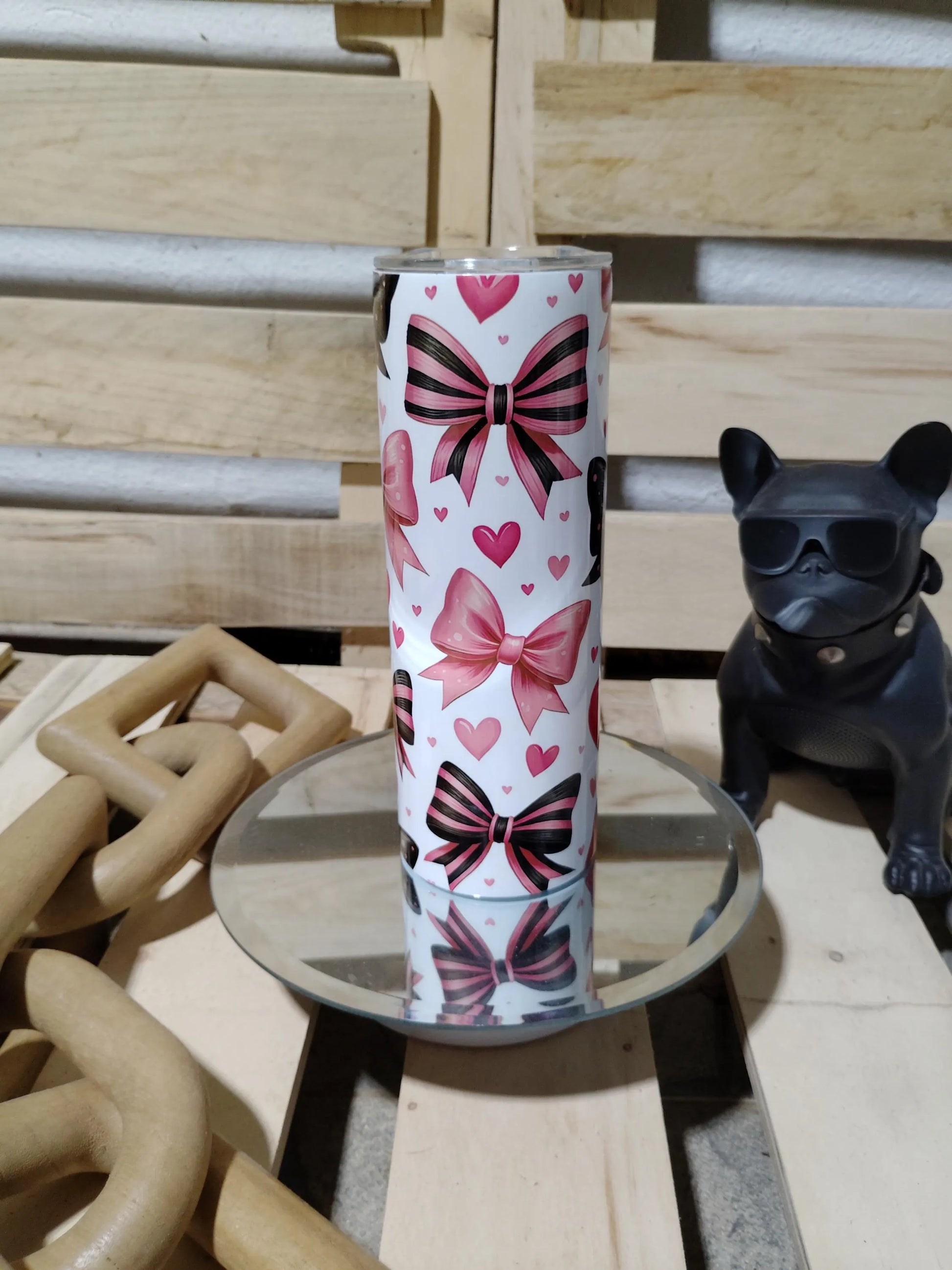 Make every sip sweet with this 20oz skinny tumbler featuring an adorable coquette design with pink and black bows, hearts, and playful charm. Perfect for iced coffee, tea, or any favorite drink, this tumbler adds a girly, aesthetic touch to your daily routine. Comes with a lid and straw — great for gifting!