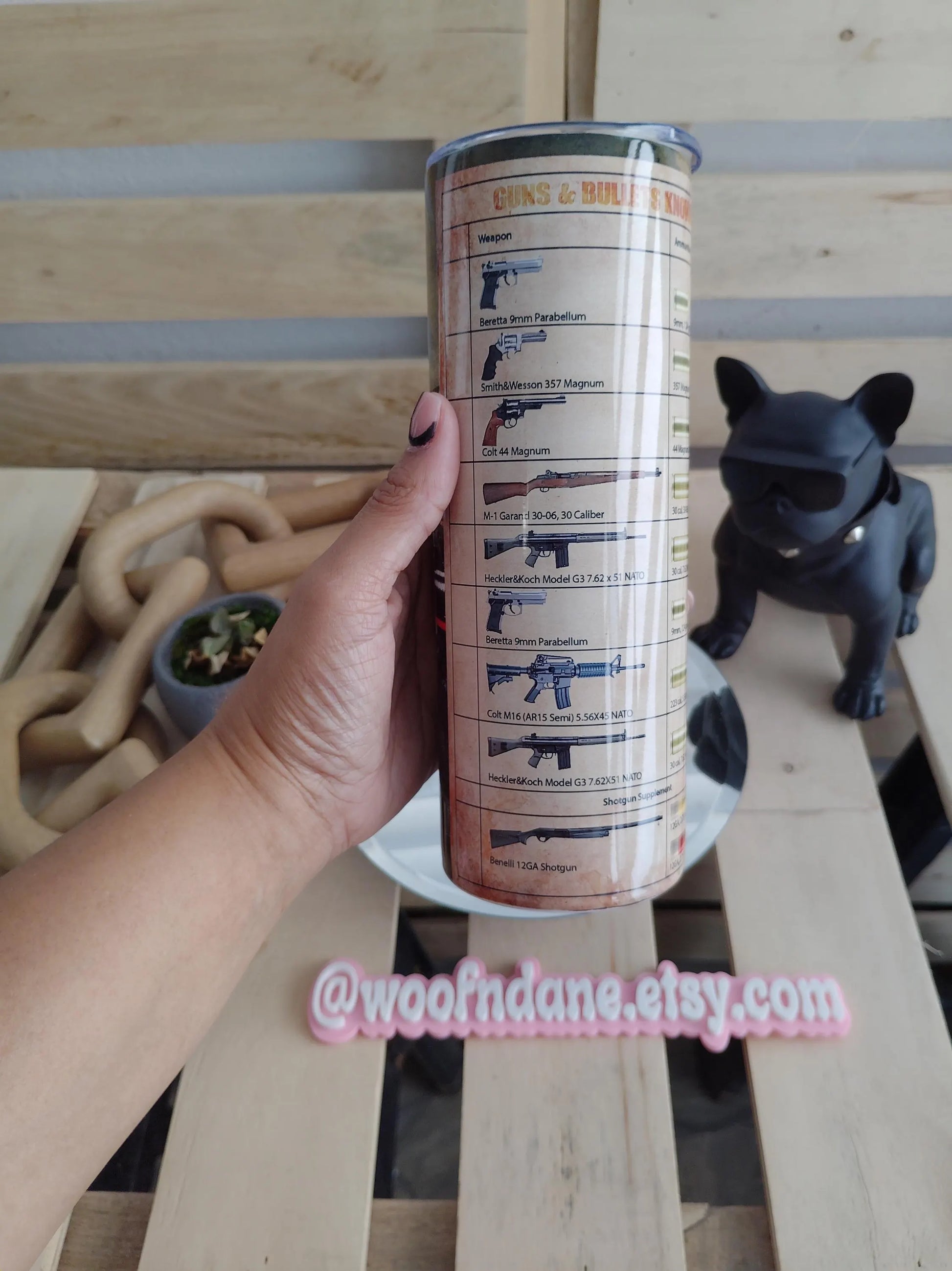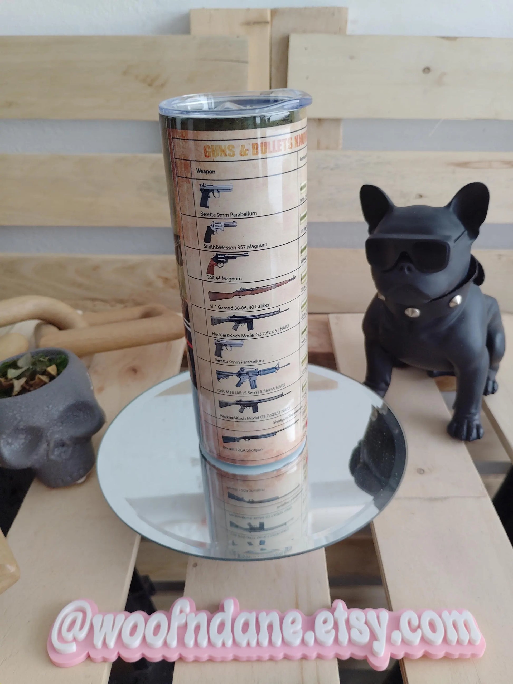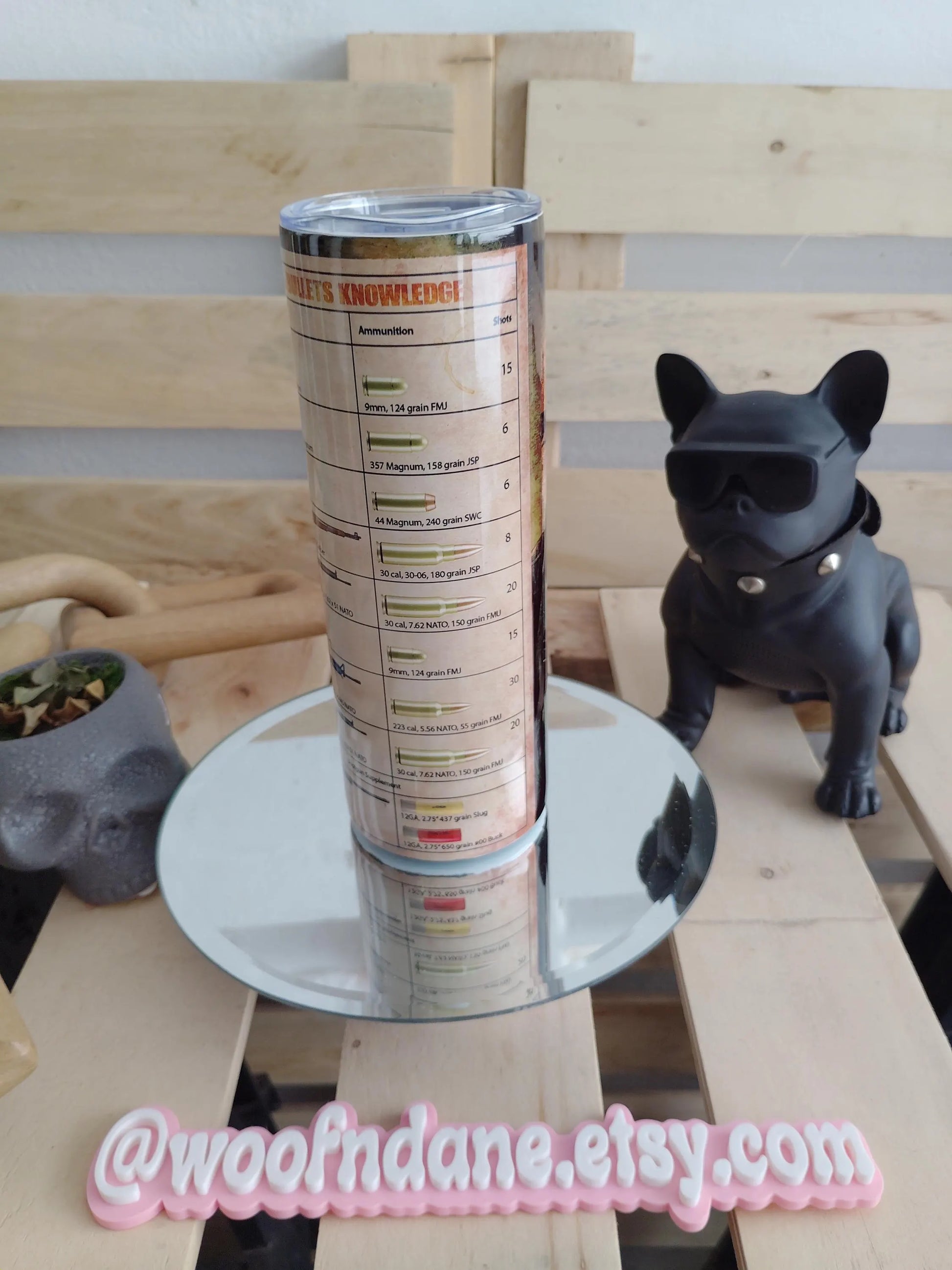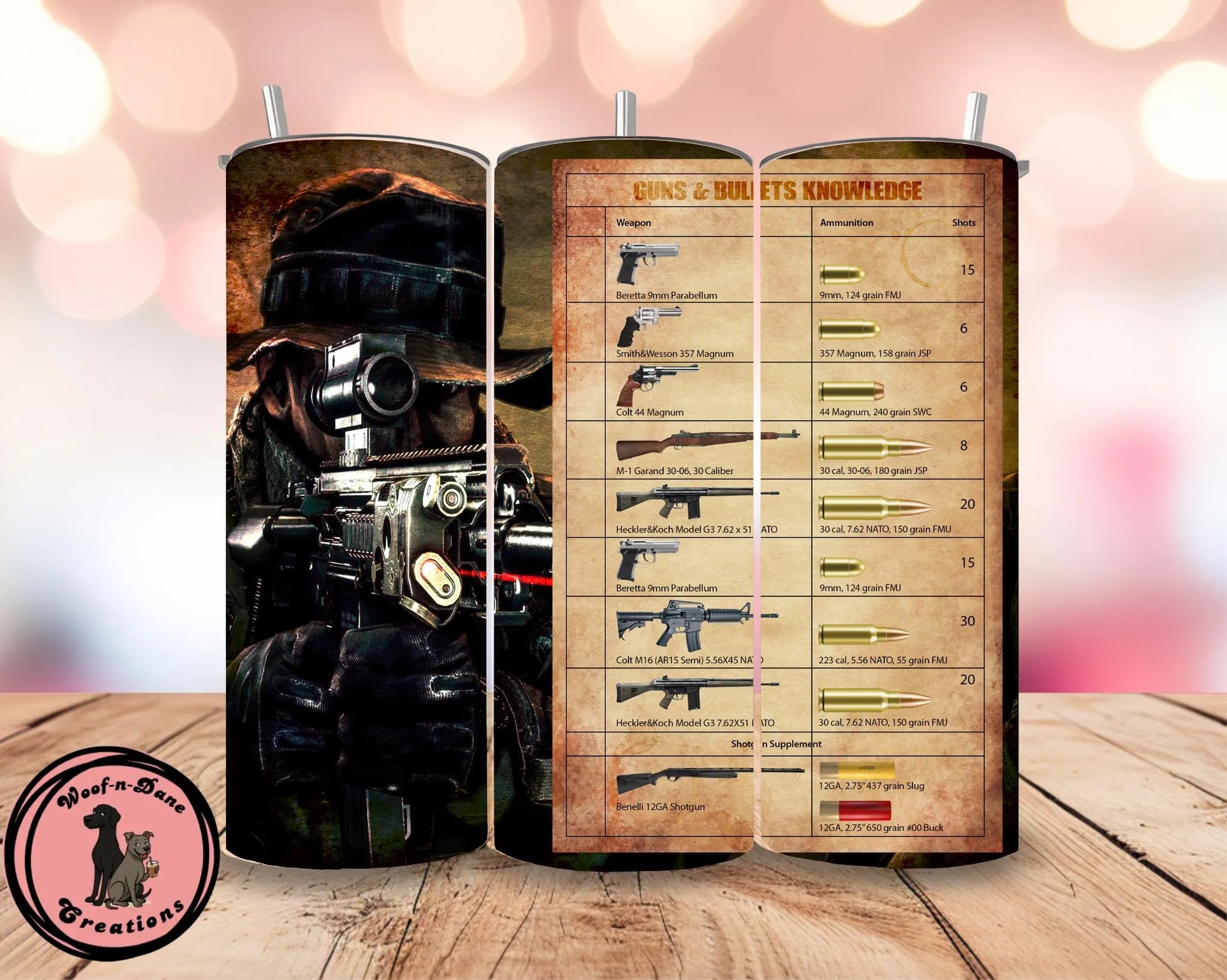 Calling all tactical and firearm enthusiasts! This bold and eye-catching 20oz tumbler features a striking “Guns & Bullets Knowledge” wrap design — complete with weapon illustrations, ammo specs, and gritty military visuals on a rustic vintage background. Whether you’re at the range or on the road, this tumbler keeps your drinks ice-cold or piping hot while making a serious statement.