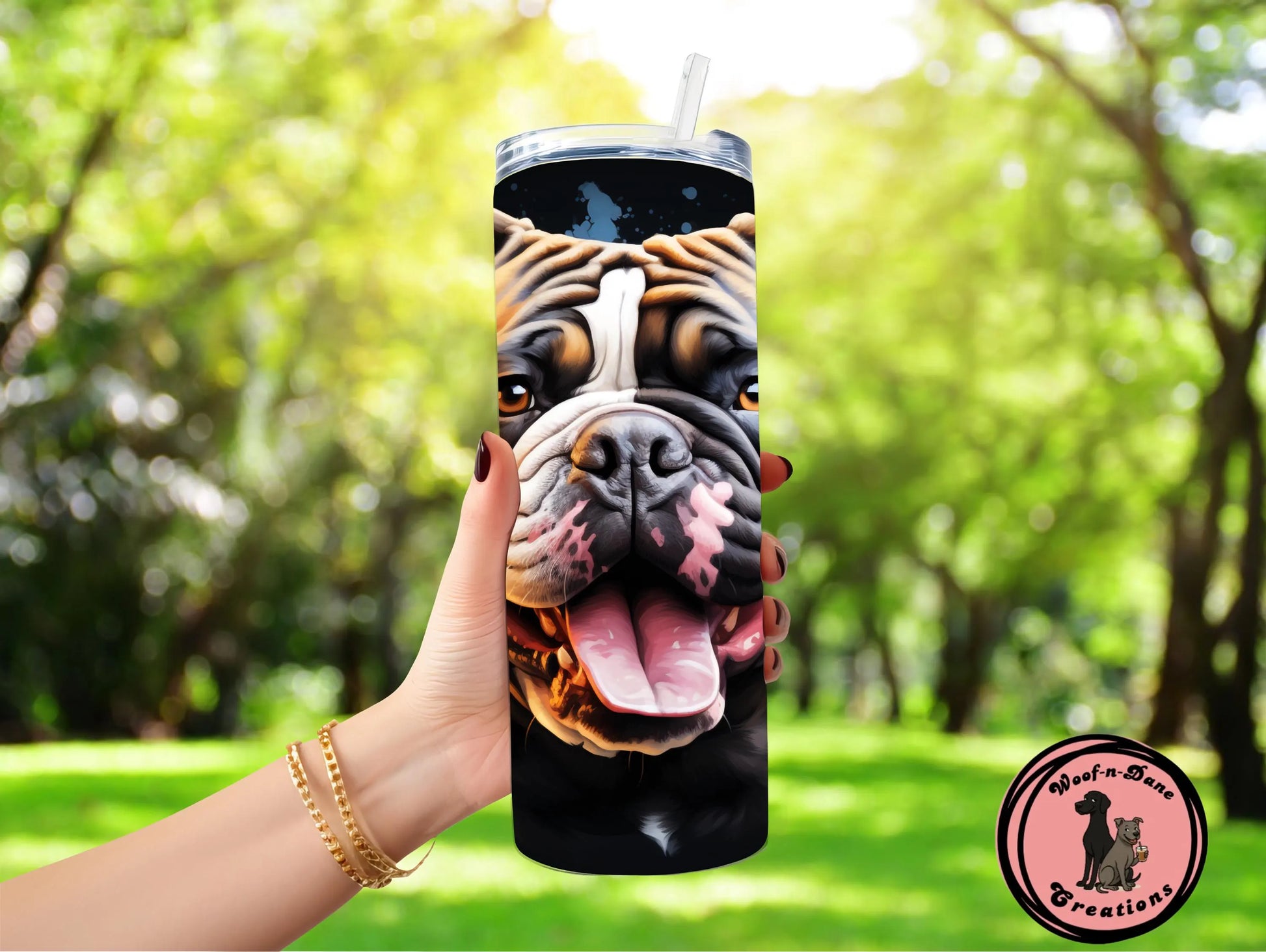 - Bulldog artwork wrapped around the tumbler