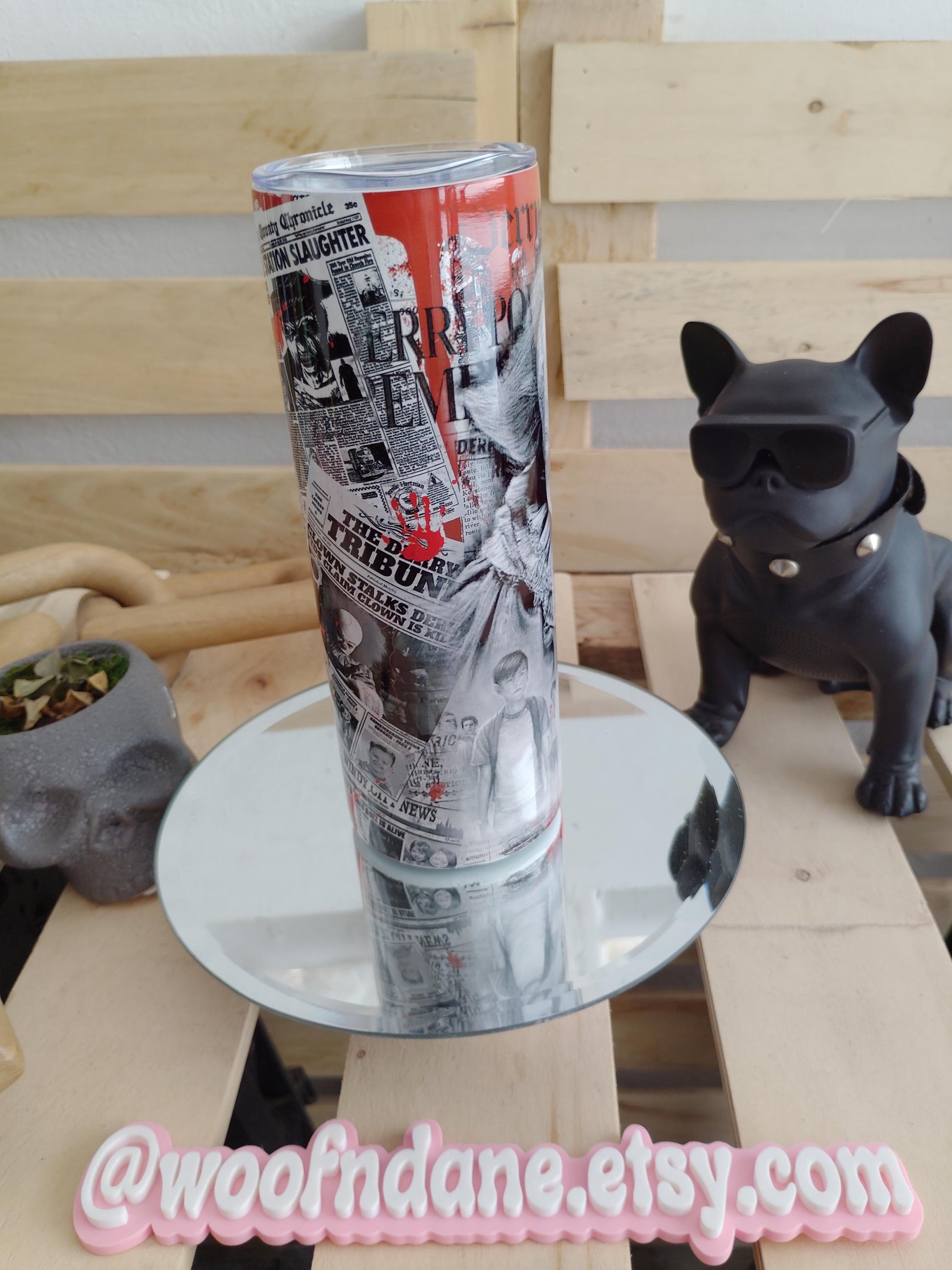 Bring your love for horror to life with this spine-chilling Pennywise 20oz tumbler, designed for true fans of Stephen King’s IT. Featuring detailed imagery of Pennywise the Clown surrounded by blood-spattered newspapers and haunting visuals from the film, this cup is a must-have collectible or gift for any horror lover.