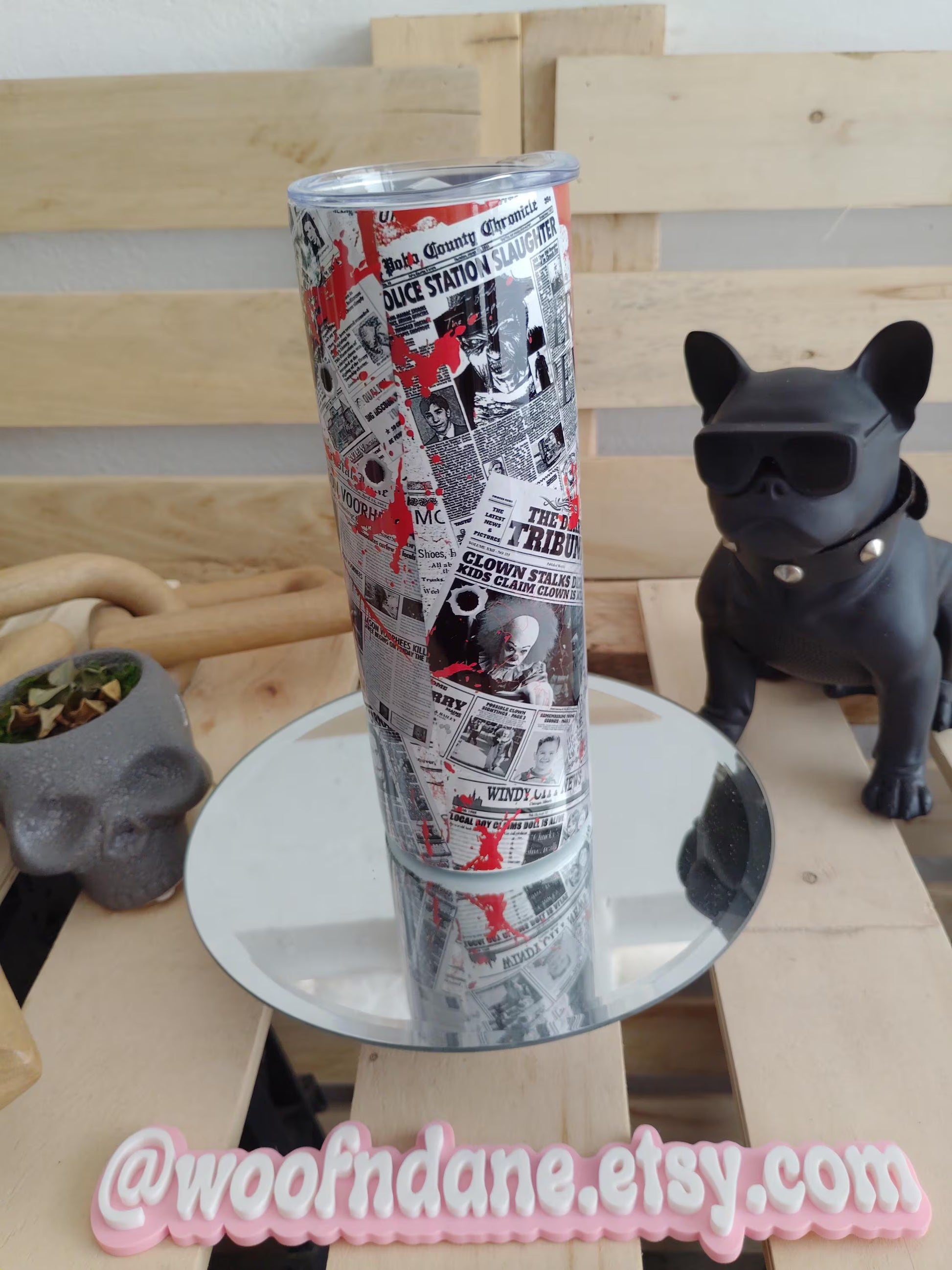 Pennywise Horror Tumbler – IT Inspired 20oz Skinny Cup with Bloody Newspaper Design