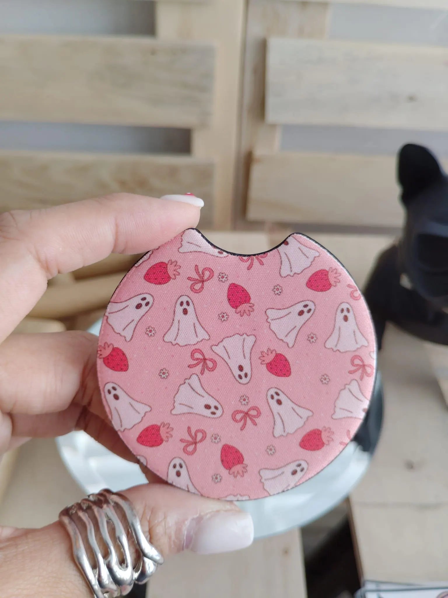 Add personality to your ride with this spooky-cute car coaster collection! Whether you're into gothic florals, Día de los Muertos sugar skulls, or sweet little strawberry ghosts, these absorbent car coasters bring style and attitude to your cup holders. Perfect gift for spooky babes, Halloween lovers, or year-round alternative vibes.