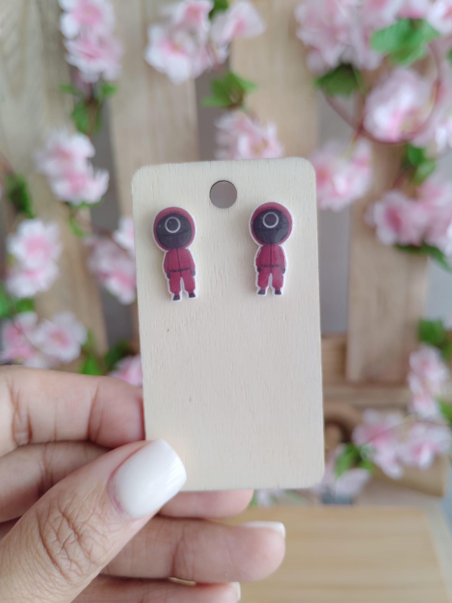 Each pair features iconic Squid Game characters and symbols brought to life in glossy, high-quality resin. Perfect for showing off your fandom or adding a pop of playful edge to your outfit.
