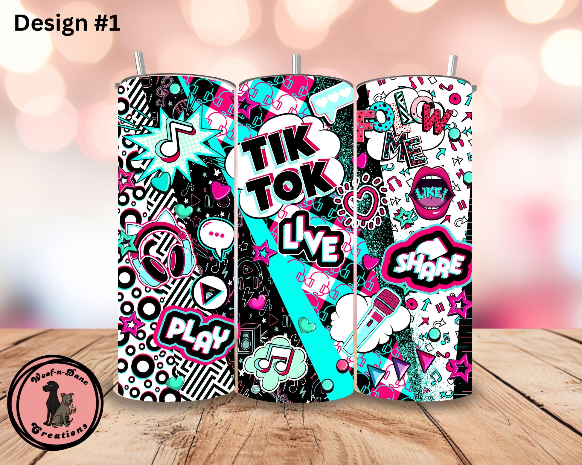 Get ready to sip in style with this bold and fun TikTok LIVE-themed 20oz tumbler! Covered in vibrant neon icons, social media symbols, and viral phrases like "Follow Me", "Play", and "Share", this tumbler is a must-have for influencers, TikTokers, or anyone obsessed with their feed!